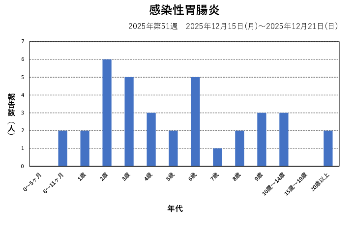 2025年第51週(12/15~12/21)の患者報告数は36名で、定点当たり報告数は減少(3.83→3.00)しました。手洗いや食材の十分な加熱等を心がけ、感染予防に努めましょう。