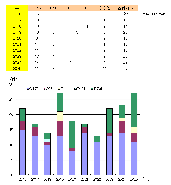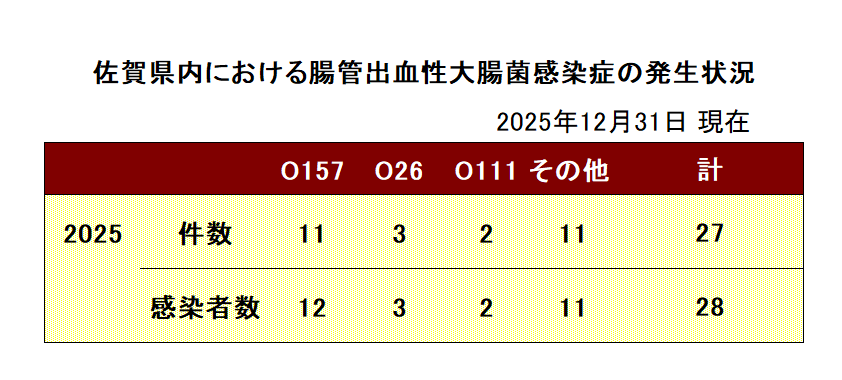 腸管出血性大腸菌感染症情報~2025年第52週~(2026年1月7日)-佐賀県 参照元URL:https://kansen.pref.saga.jp/disease/1014?yw=202552&latest=1 腸管出血性大腸菌感染症情報 佐賀県における腸管出血性大腸菌感染症の発生状況(2025年) ダウンロード 佐賀県における腸管出血性大腸菌感染症の発生状況(件数) ダウンロード 佐賀県における腸管出血性大腸菌感染症の発生状況(感染者数) ダウンロード 資料 国立健康危機管理研究機構 感染症情報提供サイト 「腸管出血性大腸菌感染症」 ページの先頭へ戻る