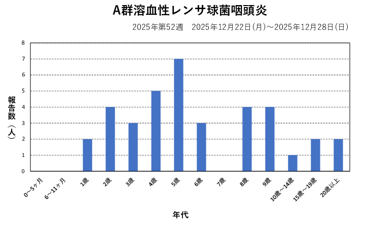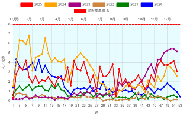 2025年第52週(12/22~12/28)の患者報告数は37名で、定点当たり報告数は減少(4.17→3.08)しました。うがいや手洗いの励行、手指消毒等で感染予防に努めましょう。