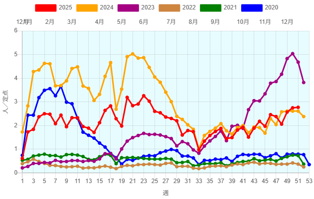 全国約2350ヶ所の小児科定点からの報告によると、2025年第51週(12/15~12/21)の患者報告数は6,512名、定点当たり報告数は2.77です。