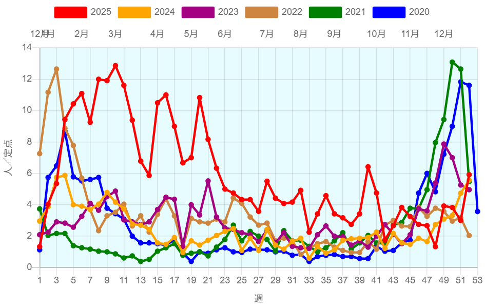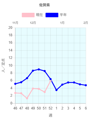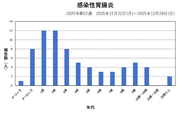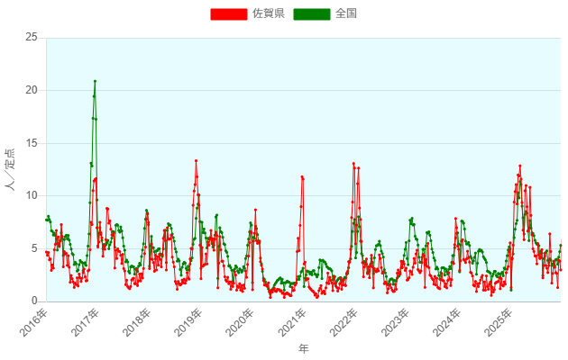 感染性胃腸炎情報~2025年第52週~(2026年1月7日)-佐賀県 参照元URL : https://kansen.pref.saga.jp/disease/2005?yw=202552&latest=1 感染性胃腸炎情報 佐賀県の状況 年代別患者報告数 ダウンロード 全国の状況 過去10年間の推移 保健所別 定点当たり報告数の推移 資料 国立健康危機管理研究機構 感染症情報提供サイト「感染性胃腸炎とは」 厚生労働省「感染性胃腸炎(特にノロウイルス)について」 感染予防の基本は、まず”手洗い” ページの先頭へ戻る