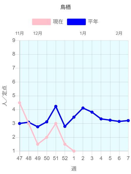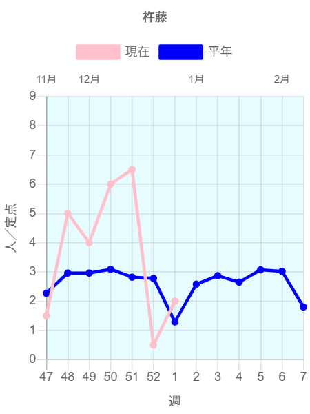 2026年第1週(2025/12/29~2026/1/4)の患者報告数は11名で、定点当たり報告数は減少(3.08→1.10)しました。うがいや手洗いの励行、手指消毒等で感染予防に努めましょう。