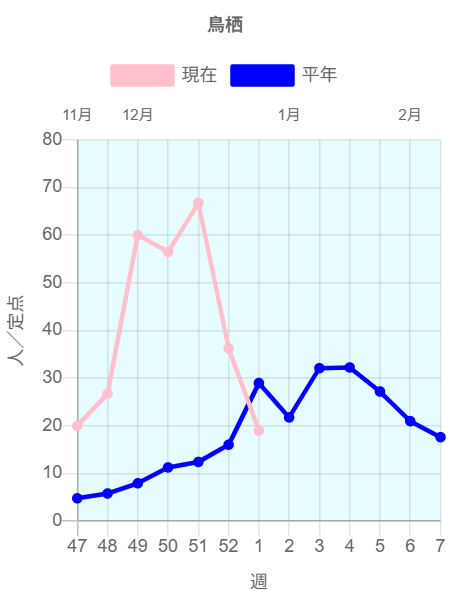 2026年第1週(2025/12/29~2026/1/4)の患者報告数は235名(A型225名※、B型8名※、型不明2名)で、定点当たり報告数は減少(39.88→10.68)しました。流行発生警報は継続中です。手洗いや咳エチケット(適切なマスクの使用など)、こまめな換気などの基本的な感染対策を行い、感染予防に努めましょう。受診される際は事前に医療機関に連絡し、マスクを着用しましょう。