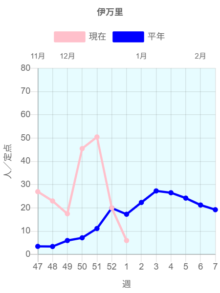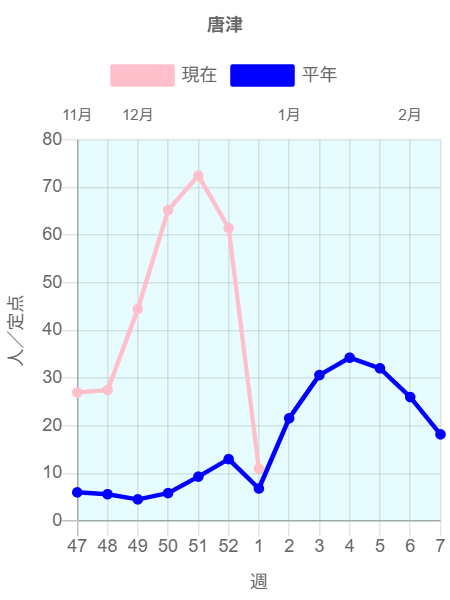 全国のインフルエンザ定点からの報告によると2025年第52週(12/22~12/28)の患者報告数87,534名、定点当たり患者数は22.77です。