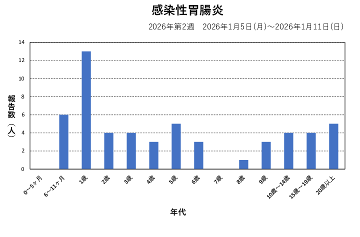 2026年第2週(1/5~1/11)の患者報告数は55名で、定点当たり報告数は増加(1.70→4.58)しました。手洗いや食材の十分な加熱等を心がけ、感染予防に努めましょう。