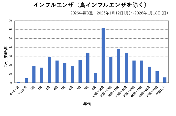 2026年第3週(1/12~1/18)の患者報告数は458名(A型319名※、B型131名※、型不明8名)で、定点当たり報告数は増加(15.58→19.08)しました。流行発生警報は継続中です。手洗いや咳エチケット(適切なマスクの使用など)、こまめな換気などの基本的な感染対策を行い、感染予防に努めましょう。受診される際は事前に医療機関に連絡し、マスクを着用しましょう。
