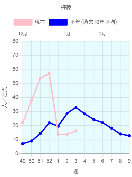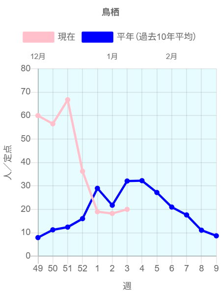 全国のインフルエンザ定点からの報告によると2026年第2週(1/5~1/11)の患者報告数39,996名、定点当たり患者数は10.54です。