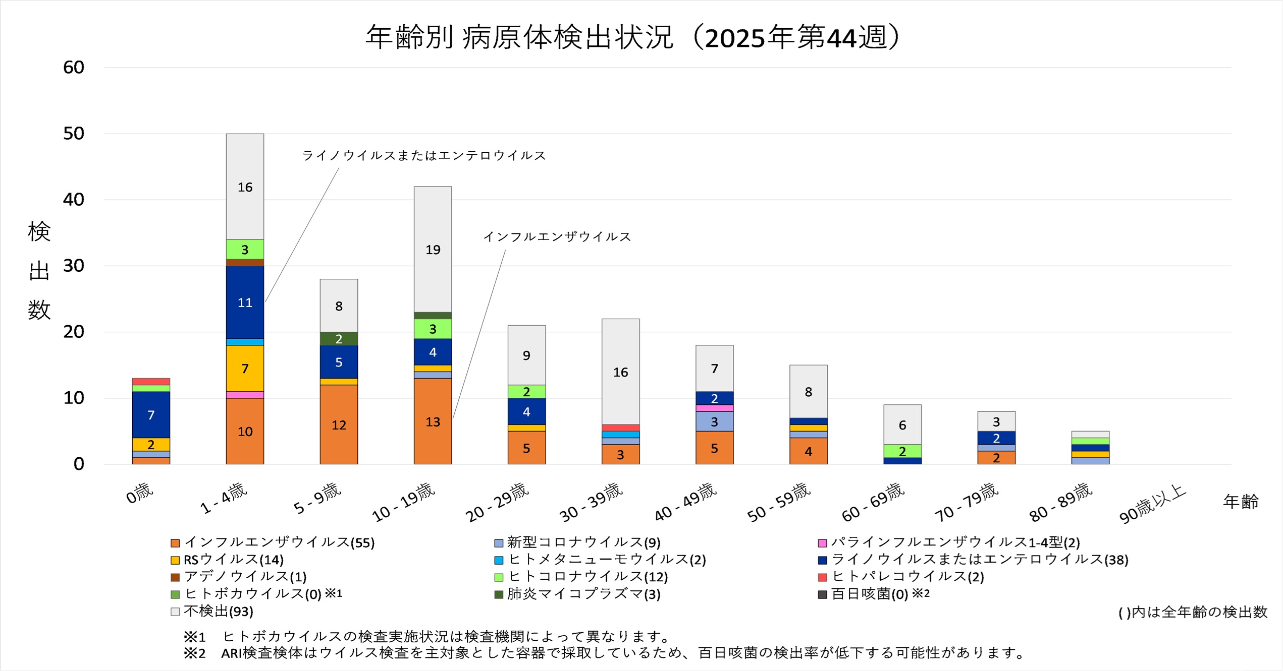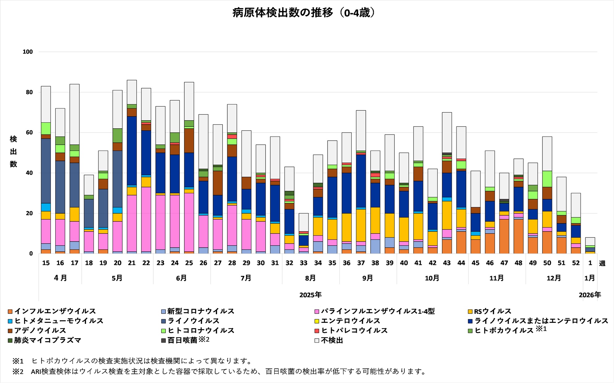 2025年44週から2026年1週までの年齢別病原体検出数の推移