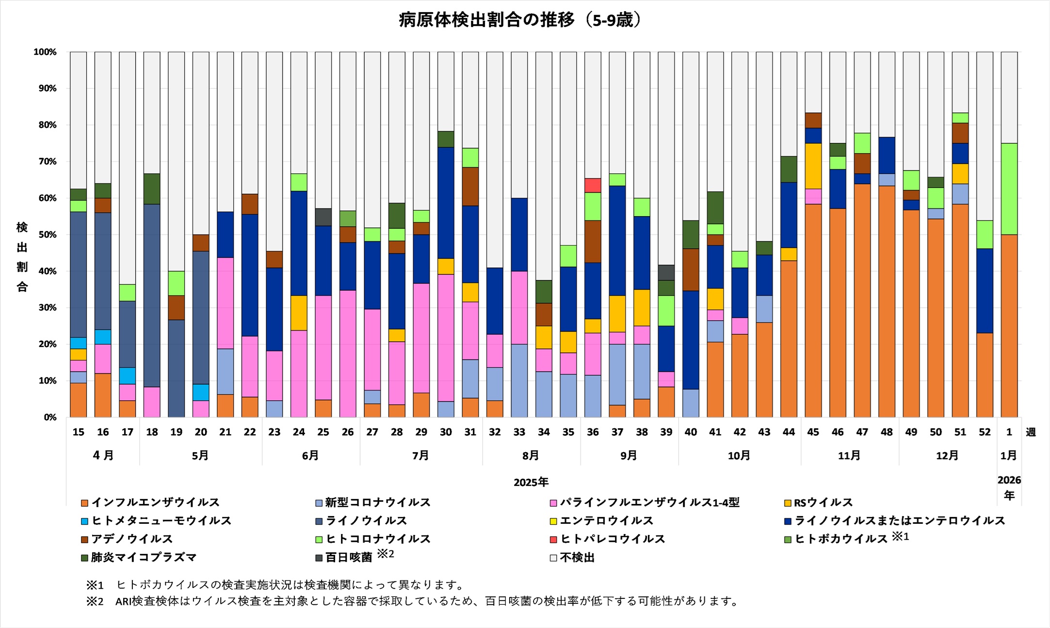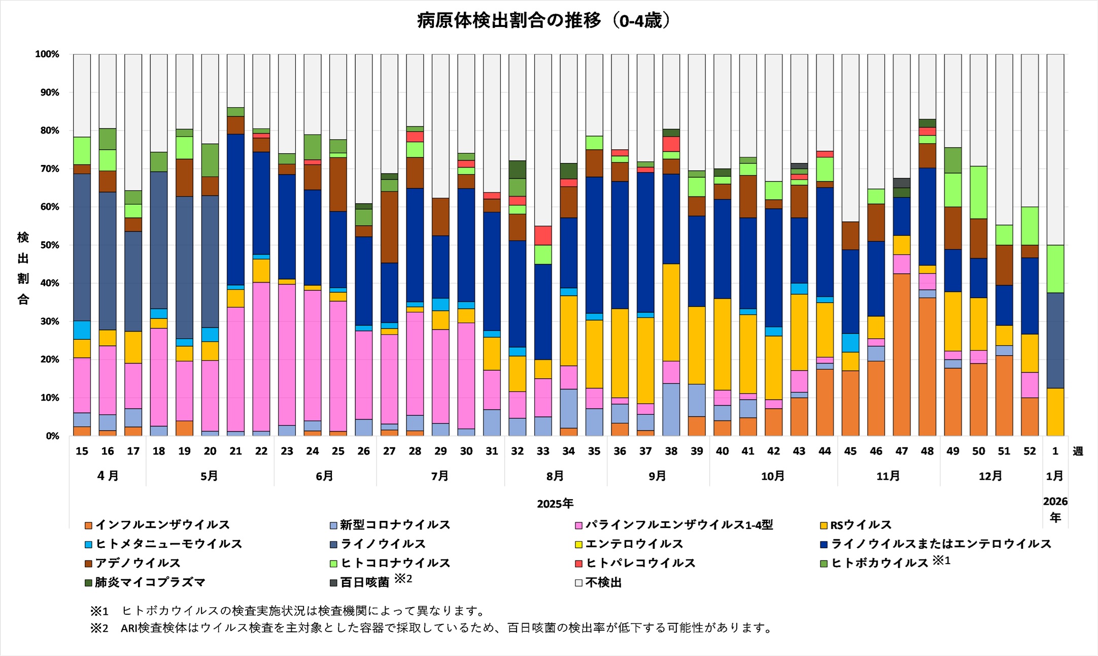 2025年44週から2026年1週までの年齢別病原体検出割合の推移