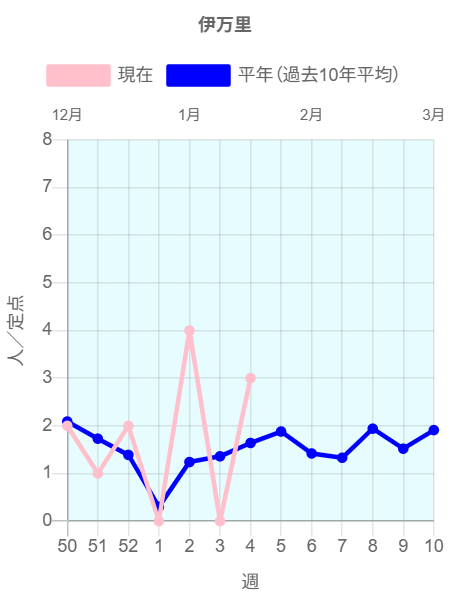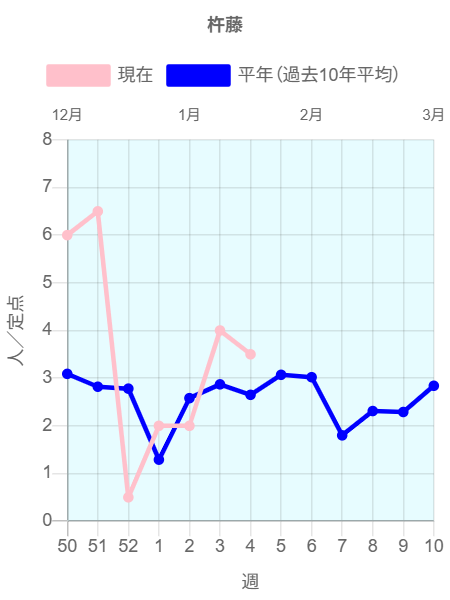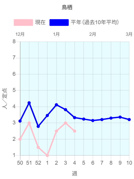 2026年第3週(1/12~1/18)の患者報告数は41名で、定点当たり報告数は増加(3.17→3.42)しました。手洗いや咳エチケット(適切なマスクの使用など)基本的な感染対策を行い感染予防に努めましょう。