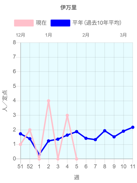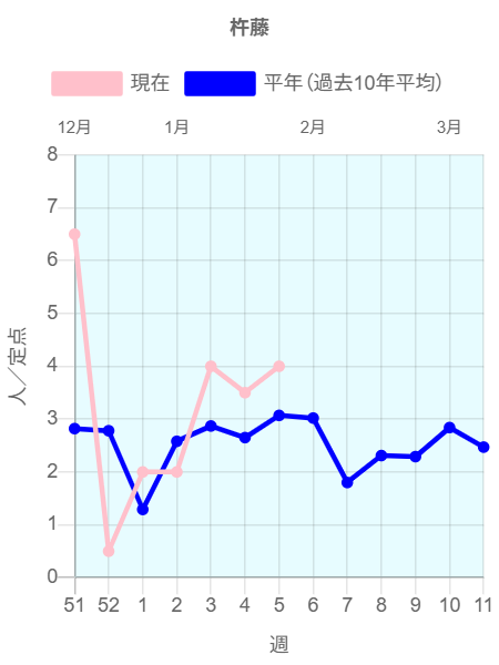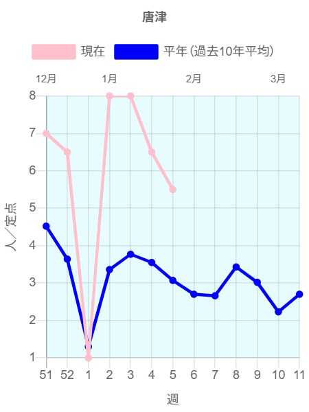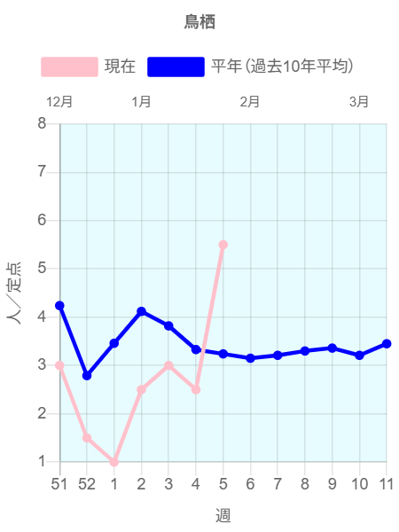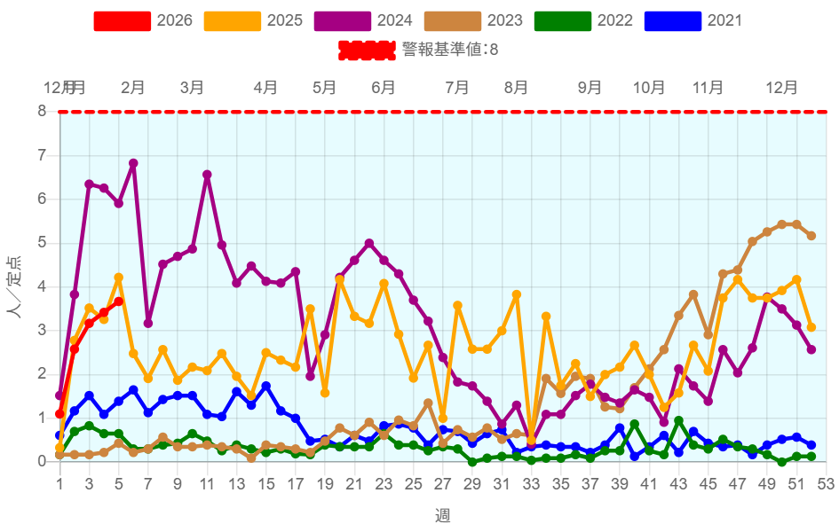 2026年第5週(1/26~2/1)の患者報告数は44名で、定点当たり報告数は増加(3.42→3.67)しました。手洗いや咳エチケット(適切なマスクの使用など)基本的な感染対策を行い感染予防に努めましょう。