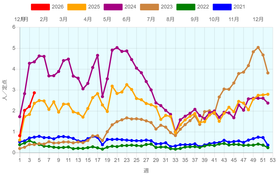 全国約2350ヶ所の小児科定点からの報告によると、2026年第4週(1/19~1/25)の患者報告数は6,622名、定点当たり報告数は2.87です。/p>