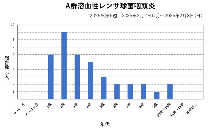 2026年第6週(2/2~2/8)の患者報告数は38名で、定点当たり報告数は減少(3.67→3.17)しました。手洗いや咳エチケット(適切なマスクの使用など)基本的な感染対策を行い感染予防に努めましょう。