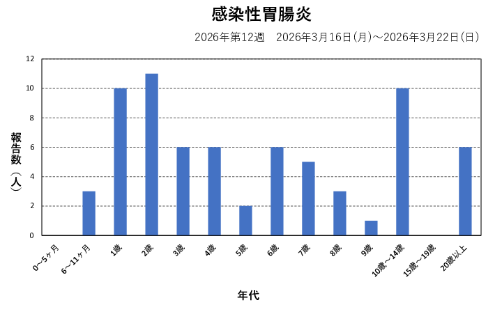2026年第12週(3/16~3/22)の患者報告数は69名で、定点当たり報告数は減少(7.17→5.75)しました。手洗いや食材の十分な加熱等を心がけ、感染予防に努めましょう。
