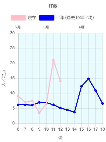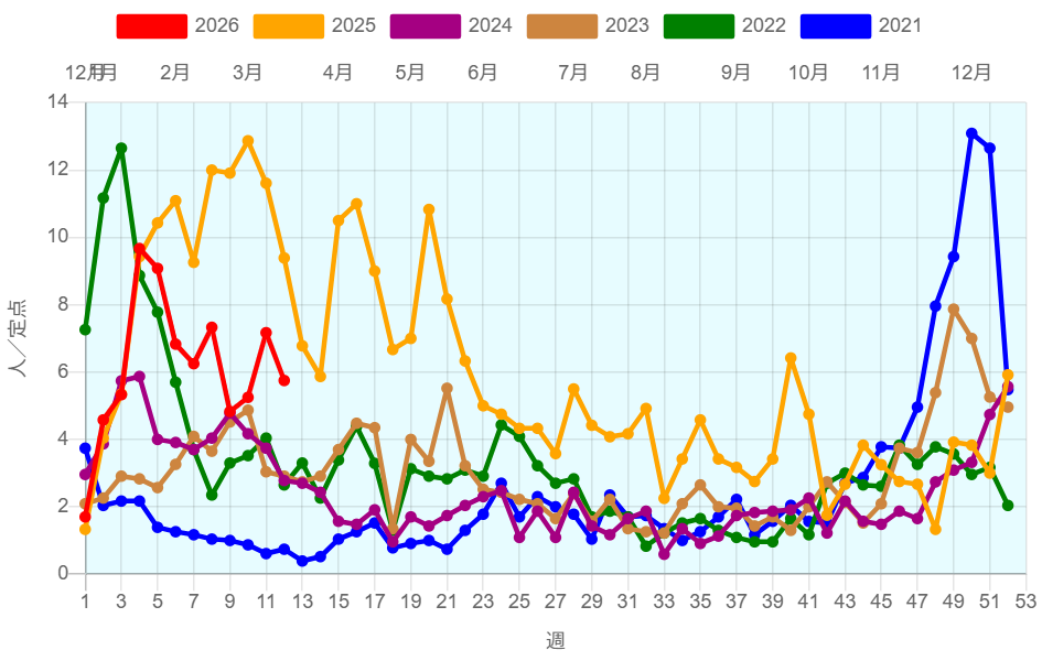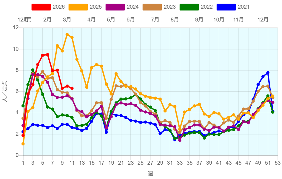 全国約2350ヶ所の小児科定点からの報告によると2026年第11週(3/9~3/15)の患者報告数14,545名、定点当たり患者数は6.32です。