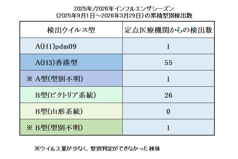 2025年/2026年インフルエンザシーズン(2025年9月1日~)の累積型別検出数