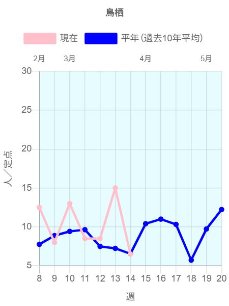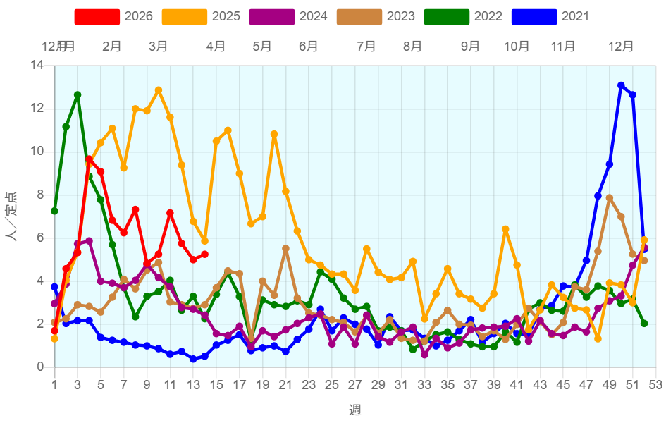 全国約2350ヶ所の小児科定点からの報告によると2026年第13週(3/23~3/29)の患者報告数12,730名、定点当たり患者数は5.54です。