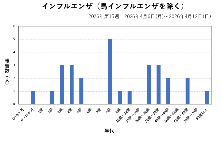 2026年第15週(4/6~4/12)の患者報告数は28名(A型1名※、B型27名※)で、定点当たり報告数は減少(2.42→1.17)しました。手洗いや咳エチケット(適切なマスクの使用など)、こまめな換気などの基本的な感染対策を行い、感染予防に努めましょう。受診される際は事前に医療機関に連絡し、マスクを着用しましょう。※迅速検査キットによる。