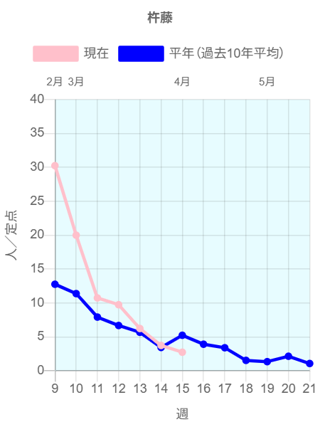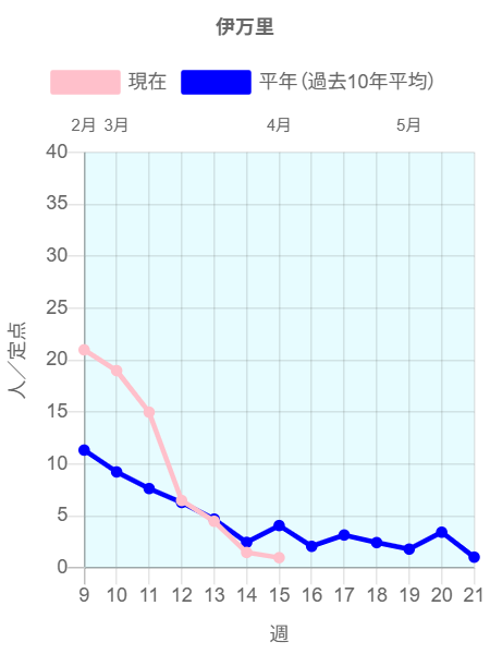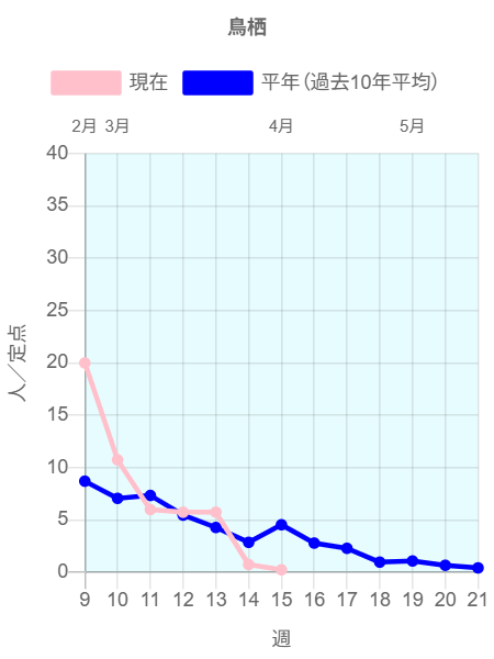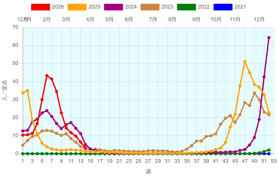 全国のインフルエンザ定点からの報告によると2026年第14週(3/30~4/5)の患者報告数12,086名、定点当たり患者数は3.21です。