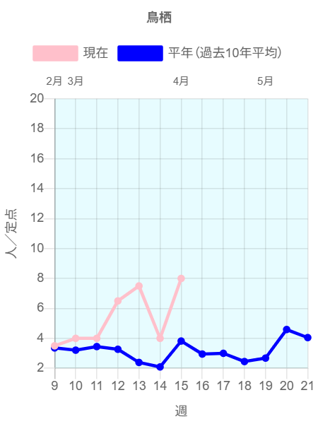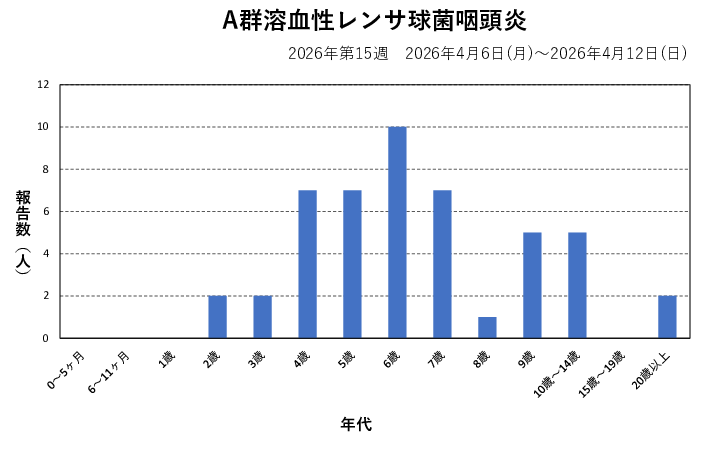 2026年第15週(4/6~4/12)の患者報告数は48名で、定点当たり報告数は減少(4.42→4.00)しました。手洗いや咳エチケット(適切なマスクの使用など)基本的な感染対策を行い感染予防に努めましょう。