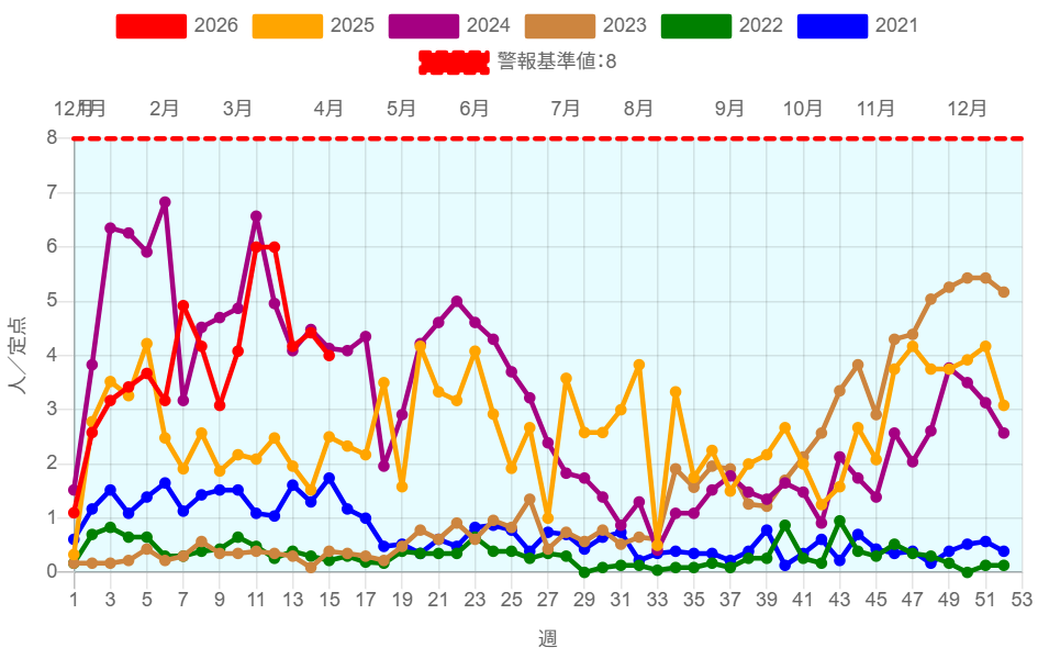 全国約2350ヶ所の小児科定点からの報告によると、2026年第14週(3/30~4/12)の患者報告数は5,058名、定点当たり報告数は2.23です。