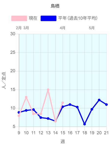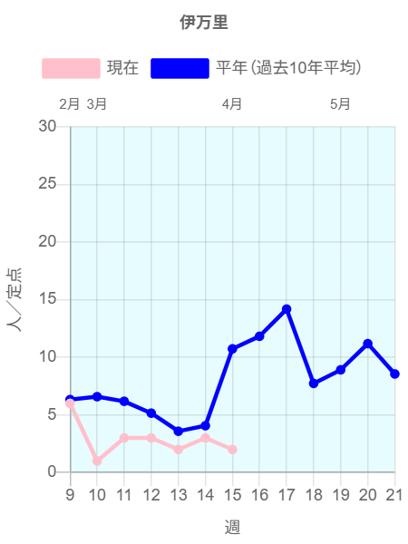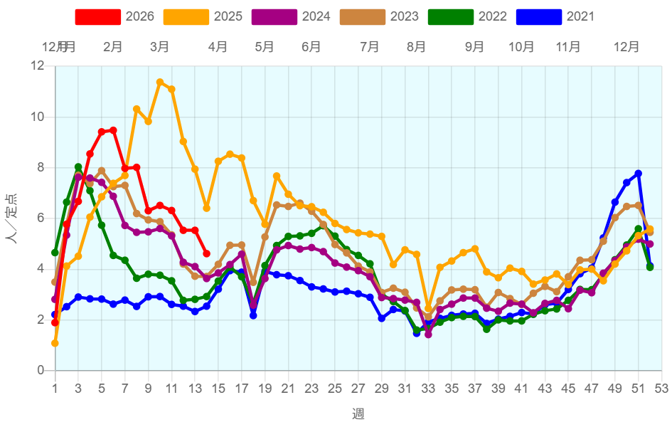 全国約2350ヶ所の小児科定点からの報告によると2026年第14週(3/30~4/5)の患者報告数10,481名、定点当たり患者数は4.62です。